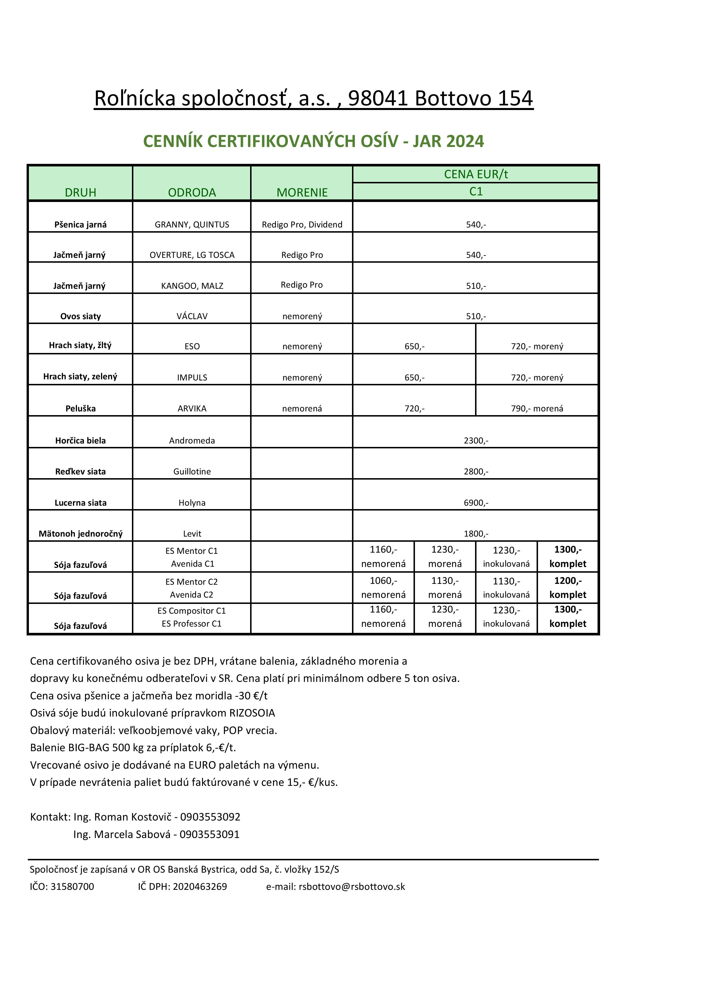 CENNÍK CERTIFIKOVANÝCH OSÍV JESEŇ 2024